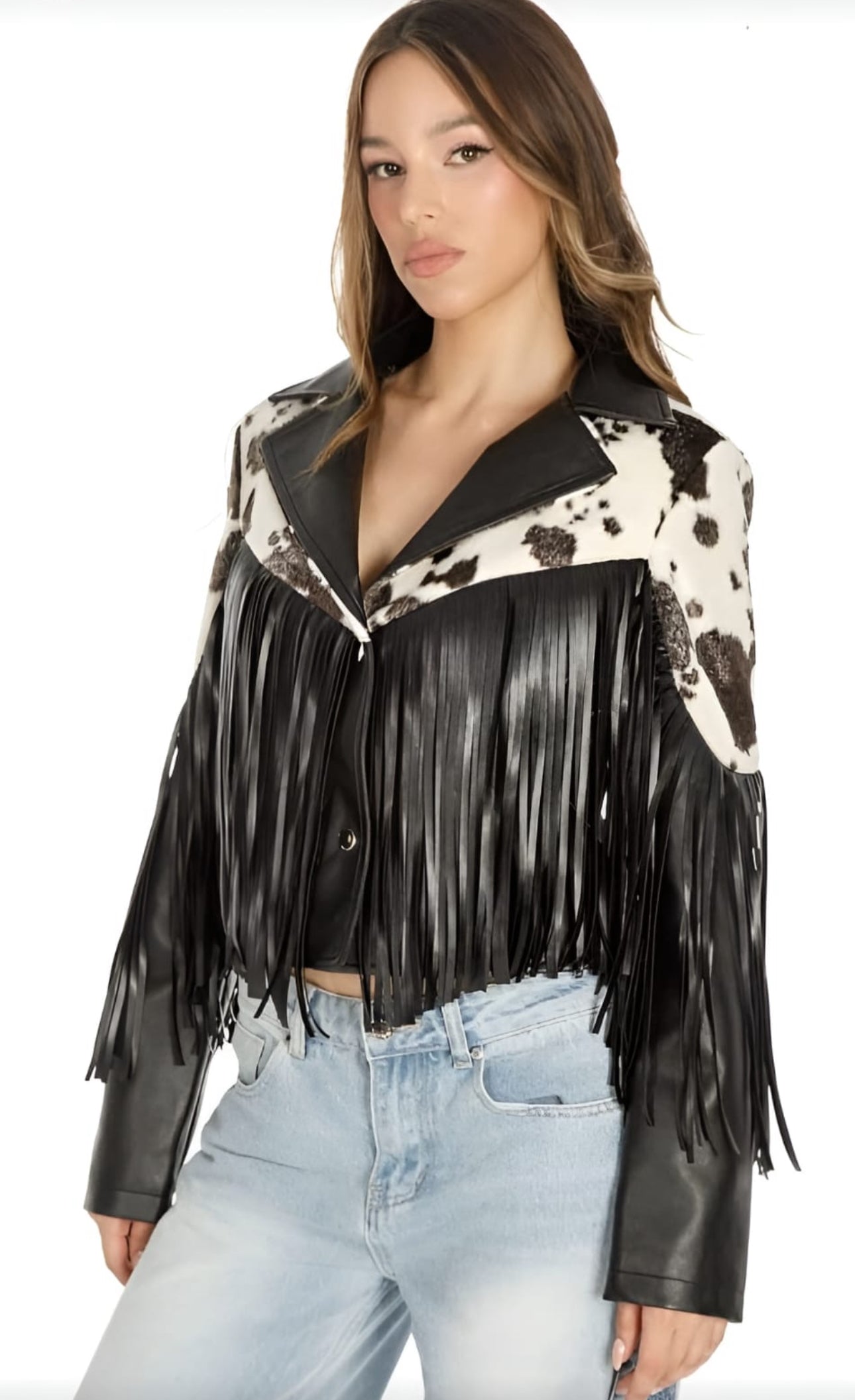 Un statement completamente! Inspiradora, digna de levantar cualquier outfit, así esta chamarra. De corte a la cintura para que la combines con pantalones o faldas de tiro alto; cuello y solapa, con estampado de vaca a contraste y detalle de flecos. Material efecto piel. *Pidela en tu talla.