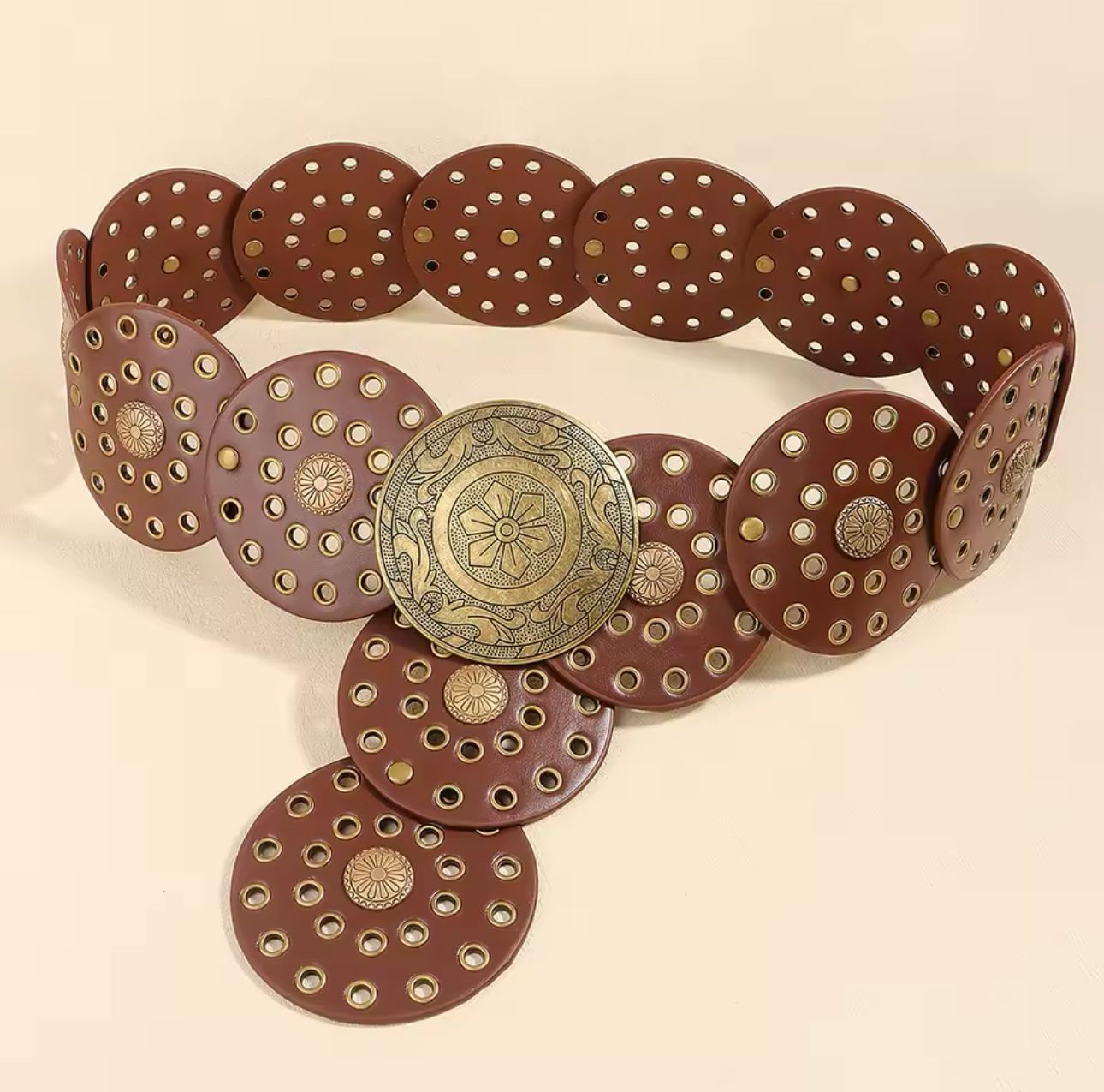 Cinto de estilo boho, con hebilla en forma de círculo y detalles grabados. Perfecto para añadir un toque único a tus outfits más casuales!