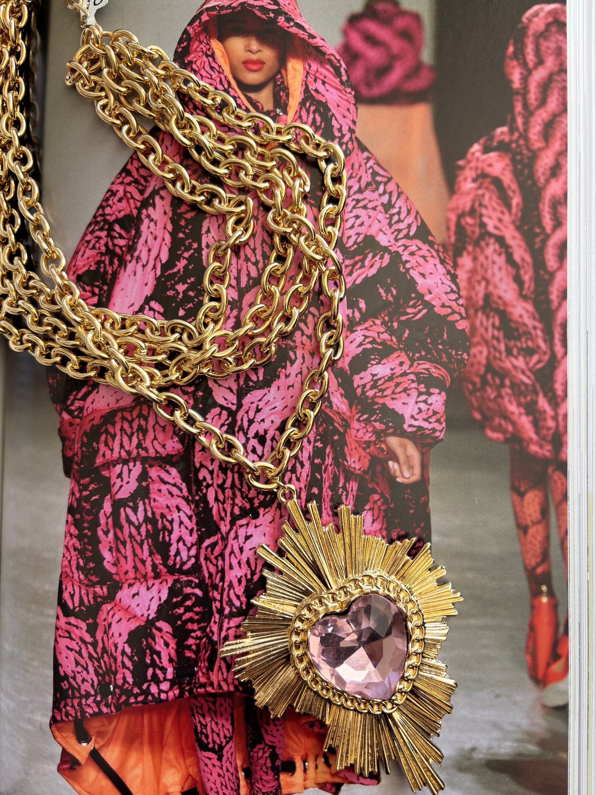 Collar de 4 cadenas con eslabones metálicos gruesos, acomodados en layering. Las cadenas en color dorado y detalle de colgante en forma de corazón. El corazón a contraste en color rosa. Es espectacular! * No mojar