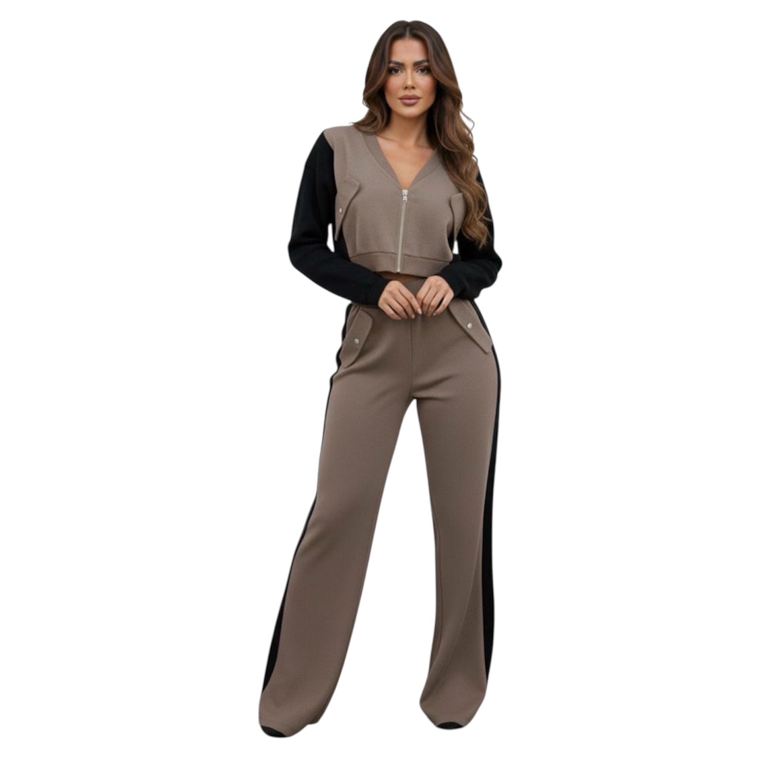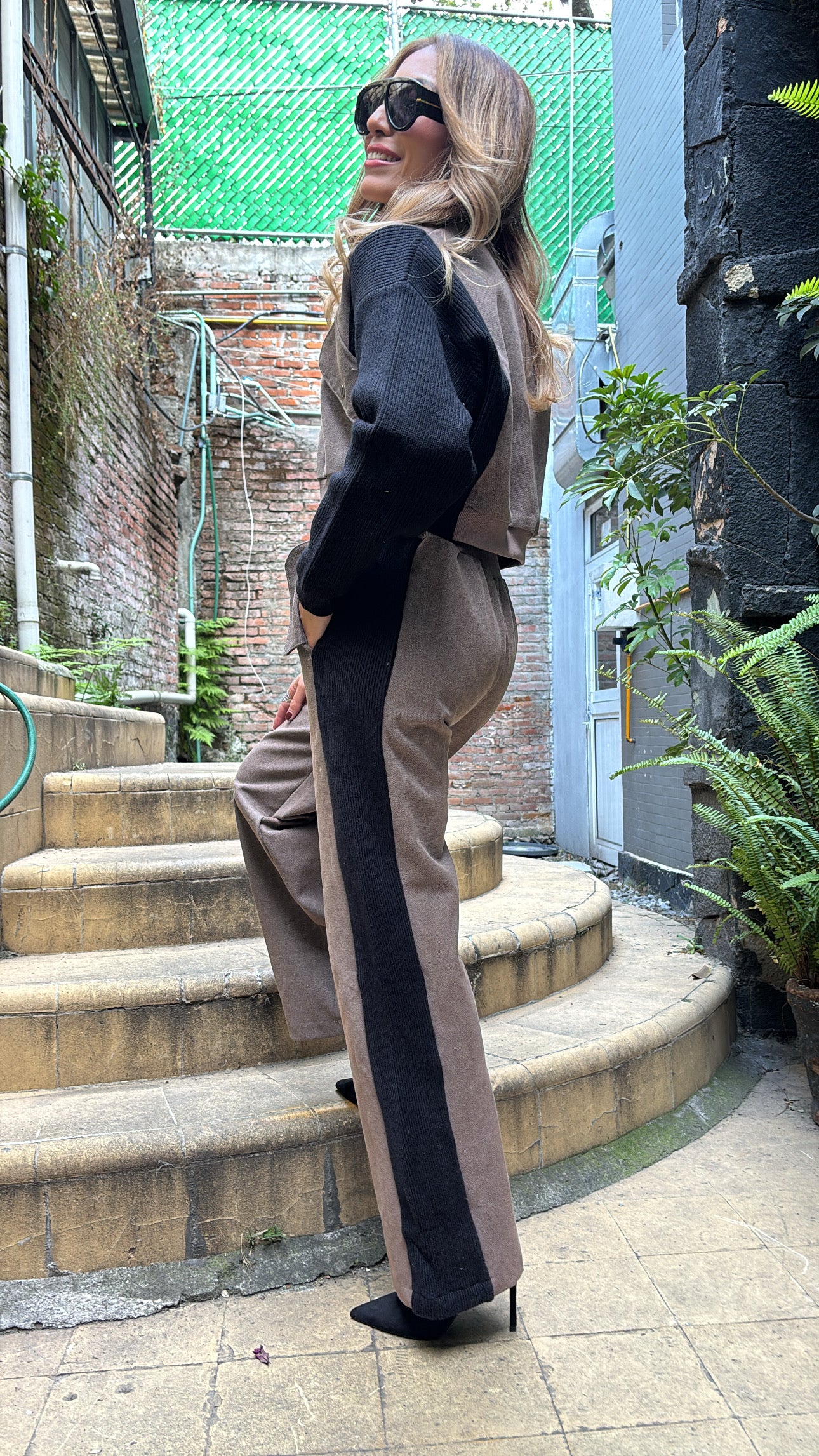 Ni punto ni mezclilla. Completamente versátil y original esta propuesta de set que podrás utilizar en diferentes ocasiones. El suéter con mangas en tejido de punto y cierre frontal; el pantalón en pierna recta con cuello y solapa. El pantalón con pretina elástica y botones a contraste, te encantará!