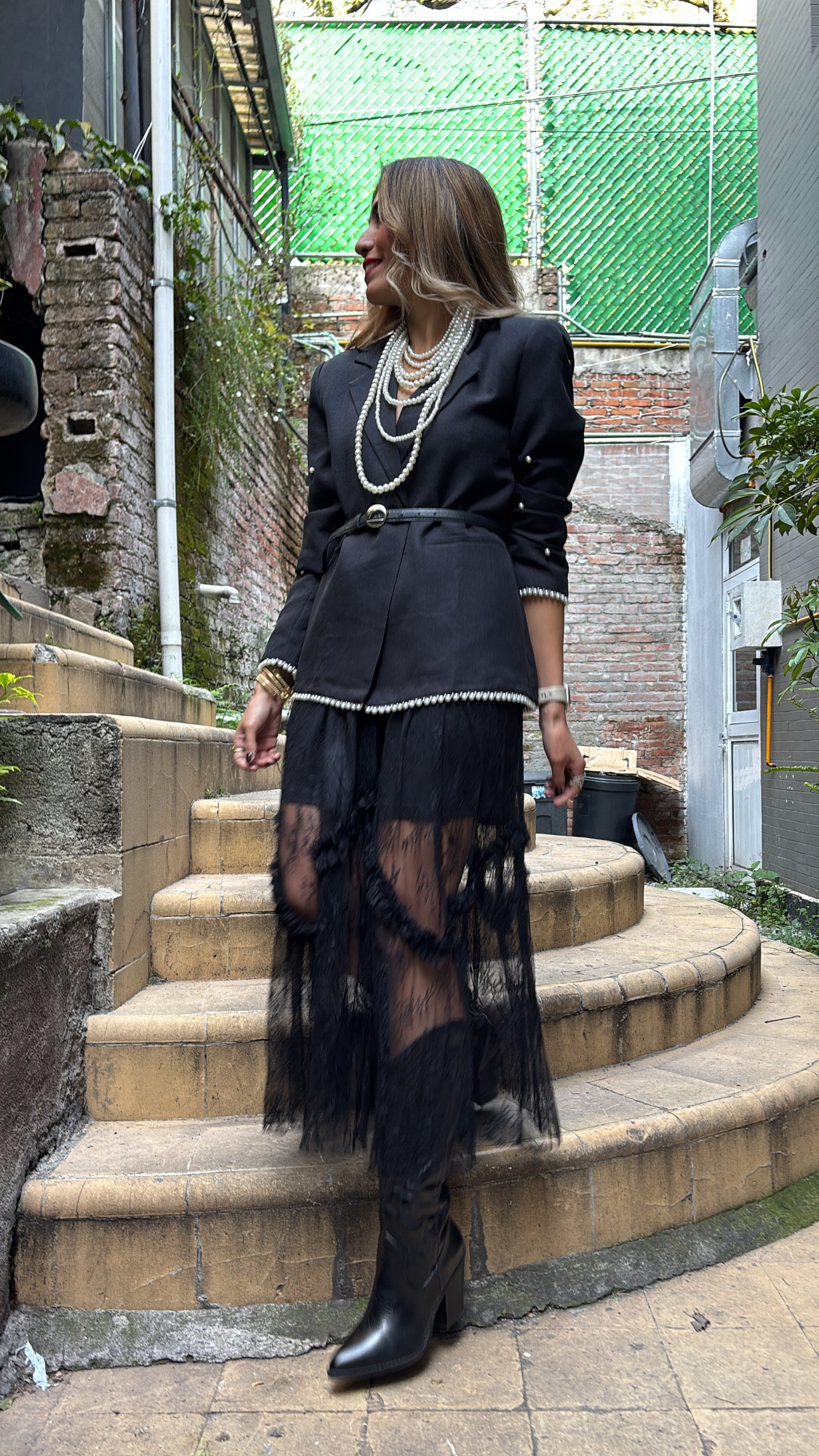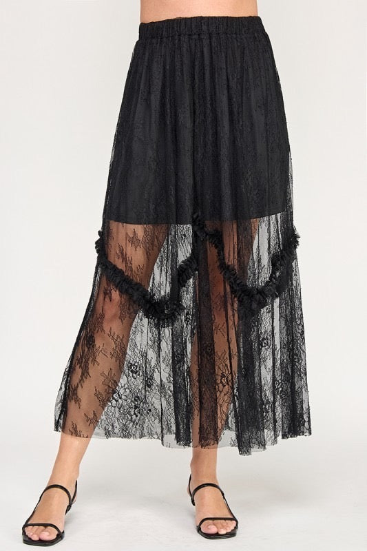 Femenina y en tendencia! Falda midi de corte alto y a la cintura, en material de encaje con spandex. Base sólida en color negro en la parte superior, y la parte baja en transparencia. La pretina es elástica, te recomiendo pedirla en tu talla. Te encantará!