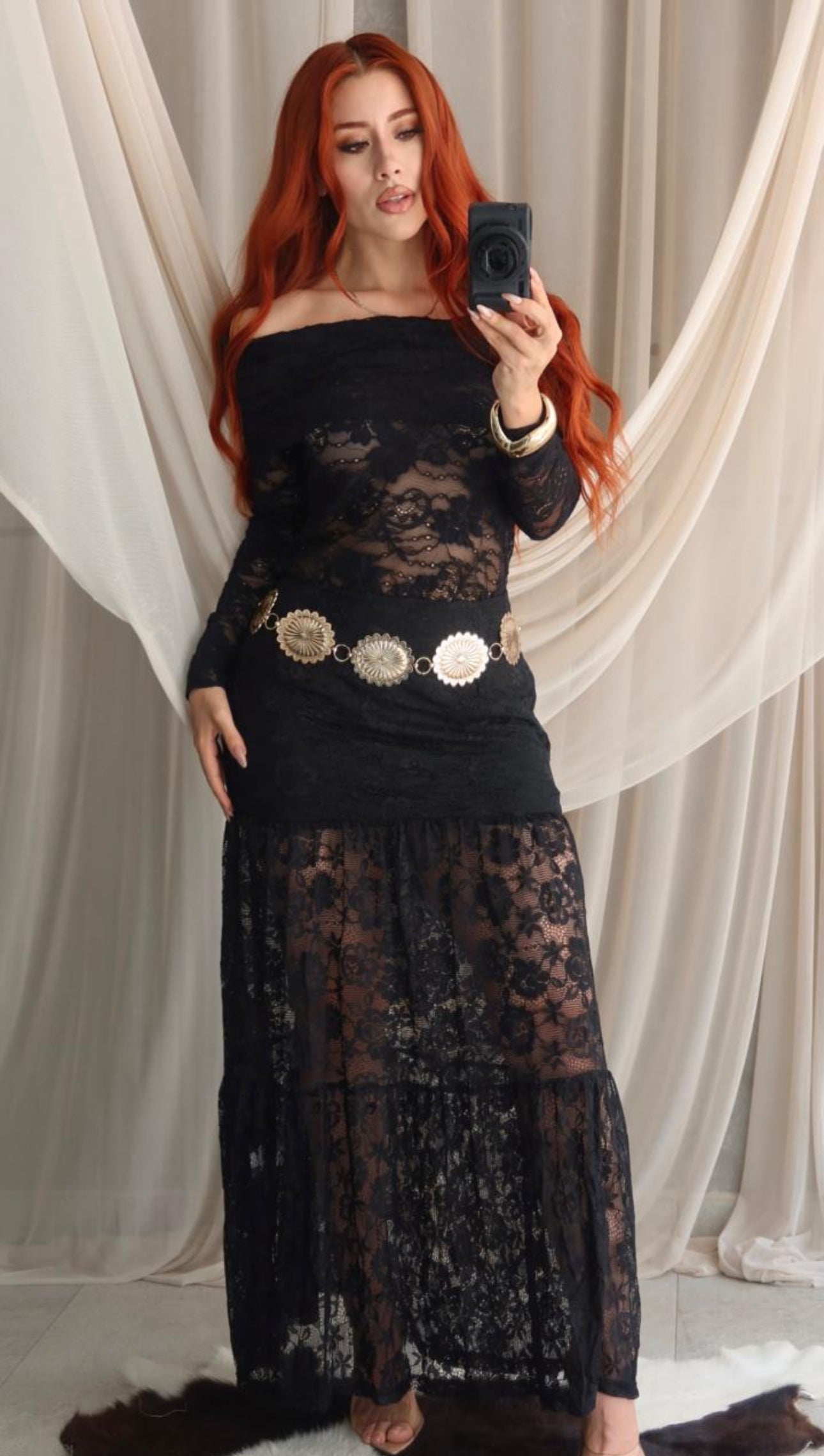 Femenina y bohemia a la vez! Falda maxi de corte alto y a la cintura, en material de encaje con spandex. Con cierre invisible lateral; base sólida en color negro en la parte superior, y la parte baja corte campesino en transparencia. Te aseguro que te encantará!