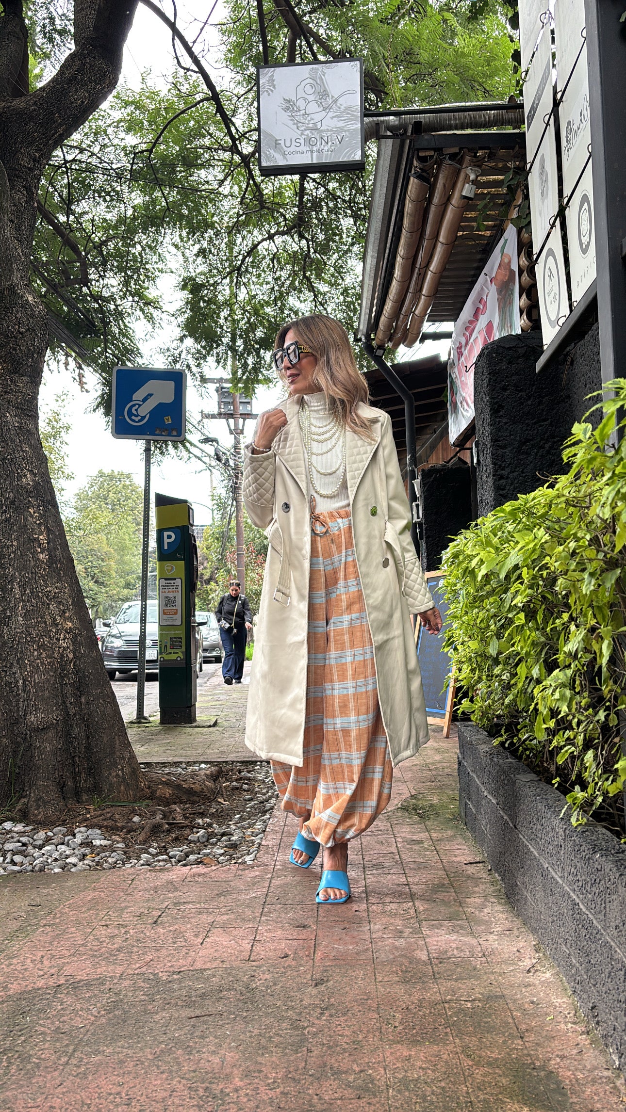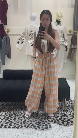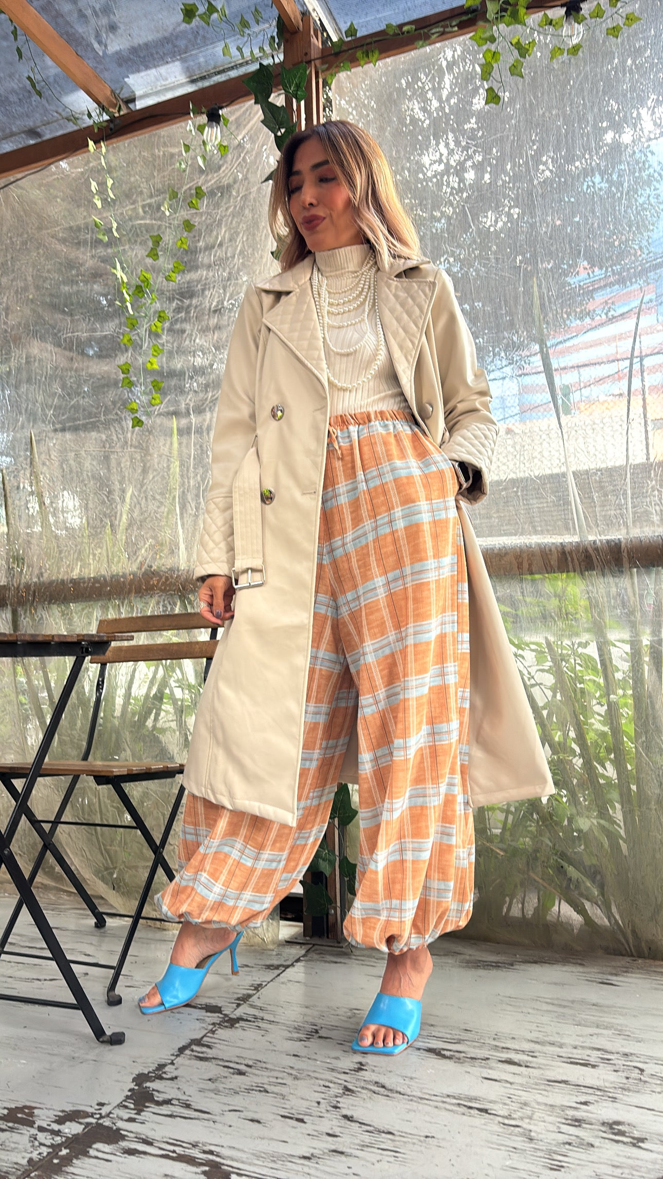 Los más virales y los más deseados! Pantalón abombado de tiro alto y a la cintura, con jareta ajustable en la pretina. Pierna holgada y elástico a la altura del tobillo, en estampado de cuadros en tonalidades marrones y azules. Los vas a amar!!!