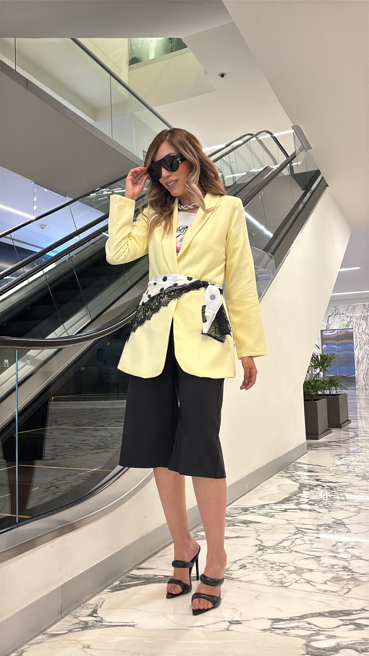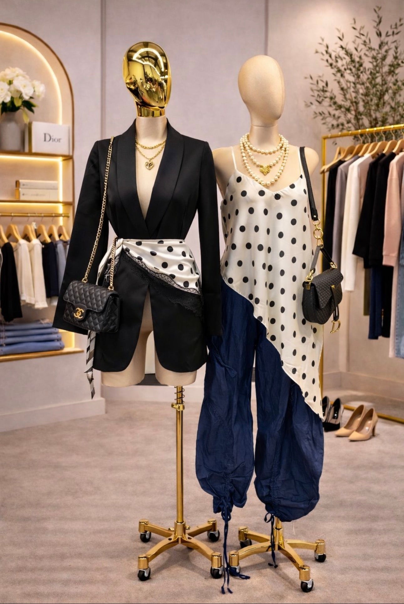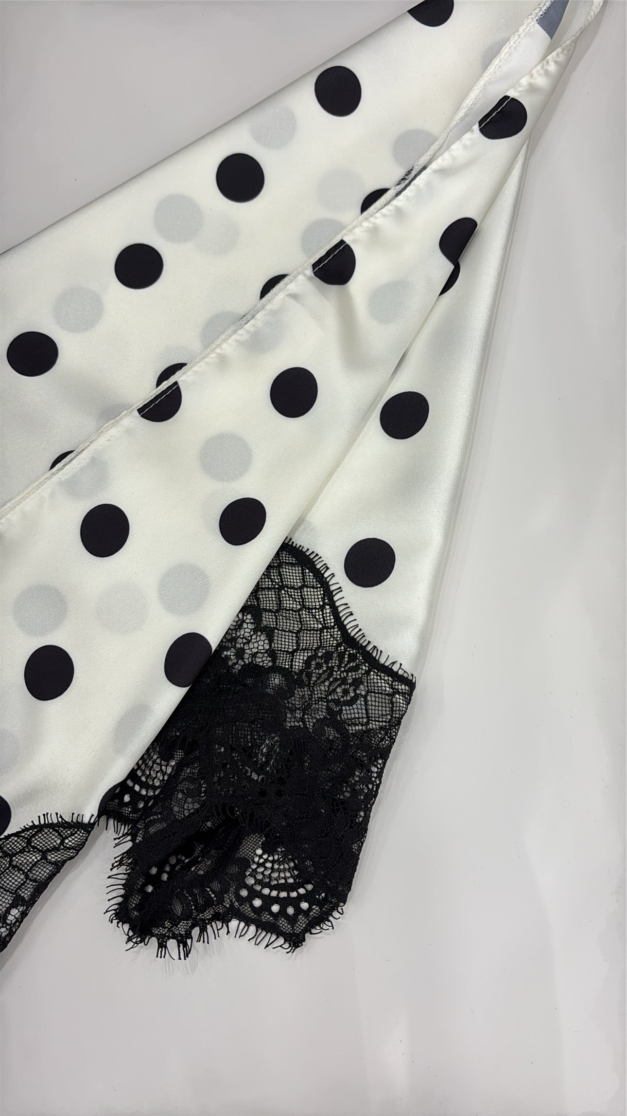 Mascada tipo pañuelo triangular, con olán de encaje; en material satinado. Estampado de lunares blanco y negro.