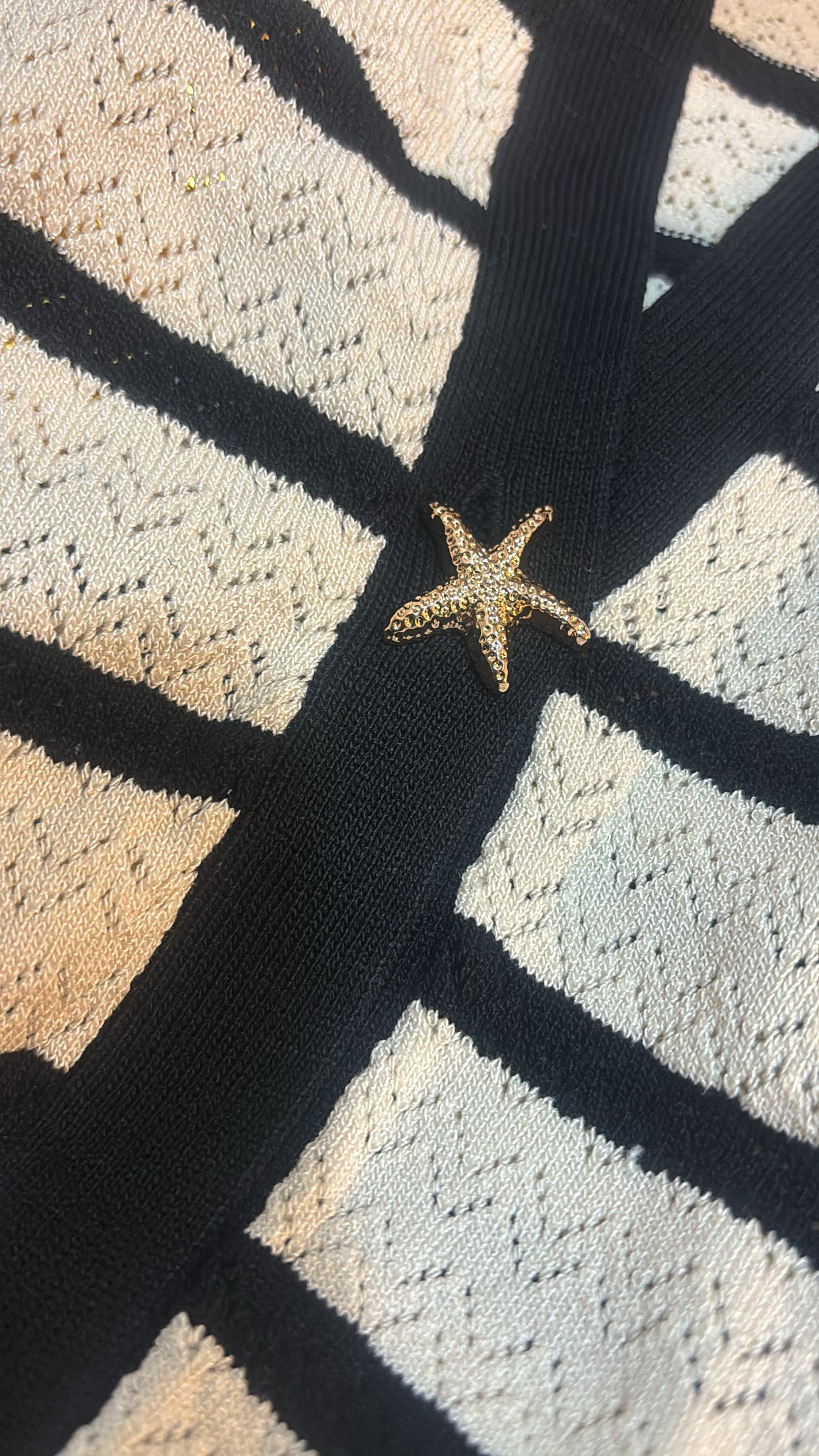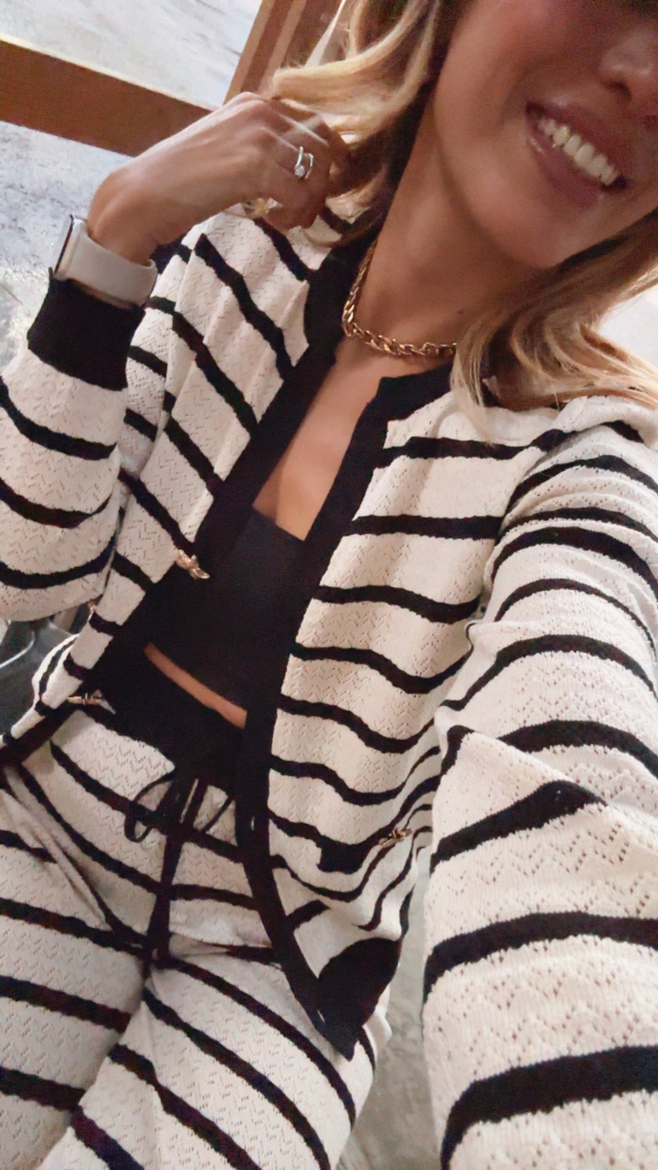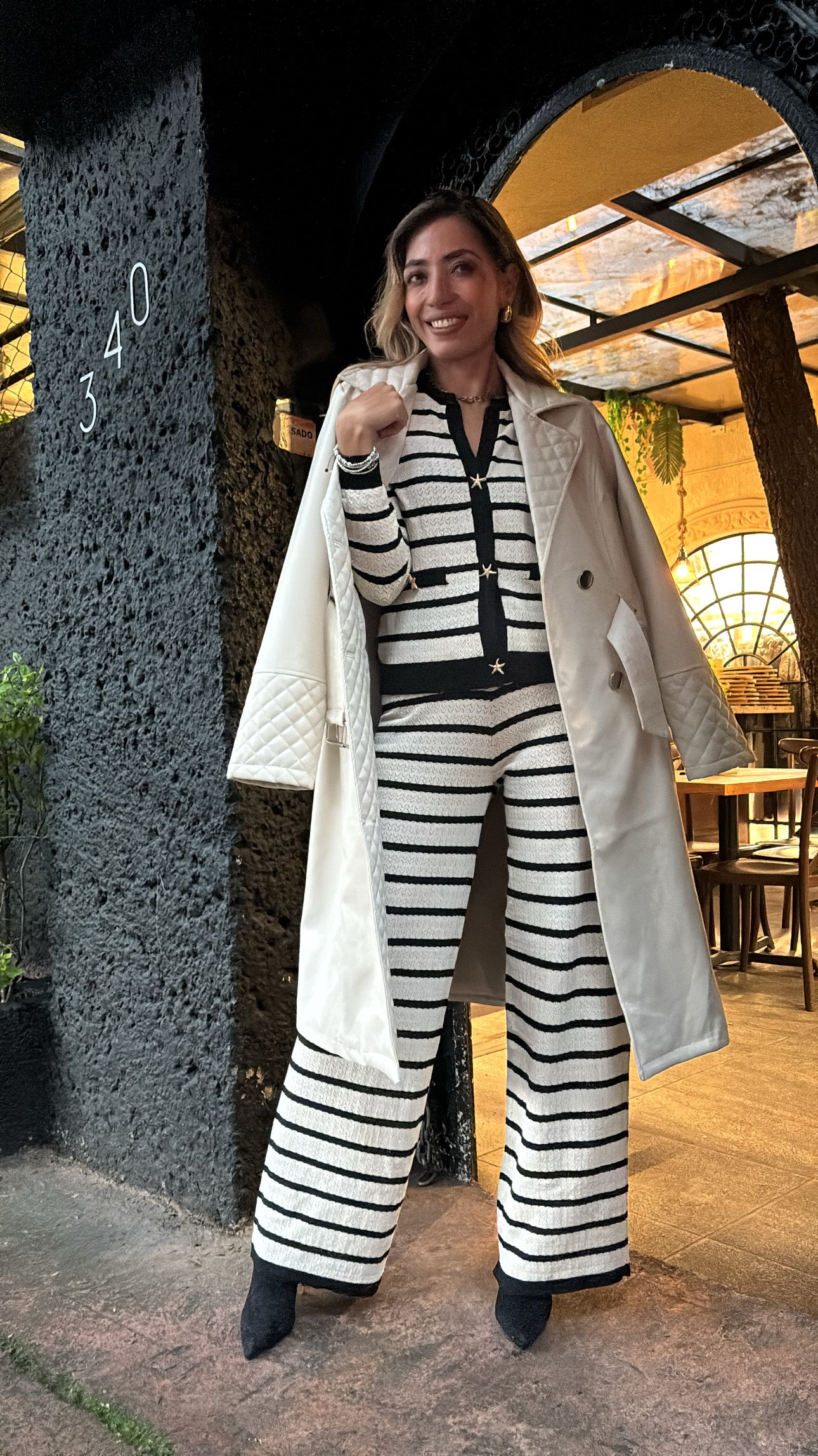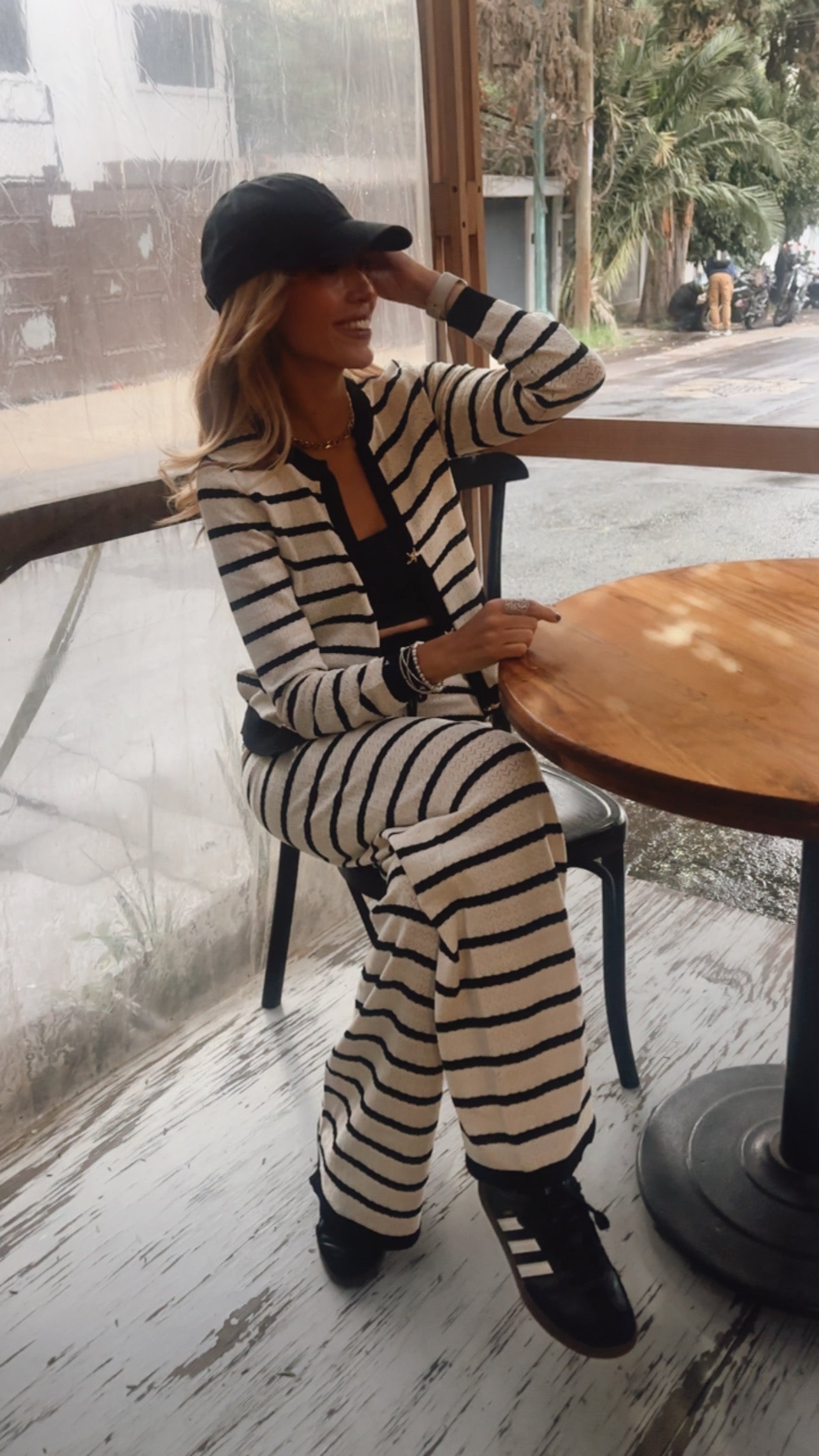 Set de dos piezas, suéter y pantalón ligero tipo crochet. El pantalón de corte a la cintura y pierna recta, con pretina elástica y jareta ajustable. El suéter en material ligero, con botones a contraste en color dorado con elementos marinos. Material que se amolda al cuerpo, pídelo en tu talla!