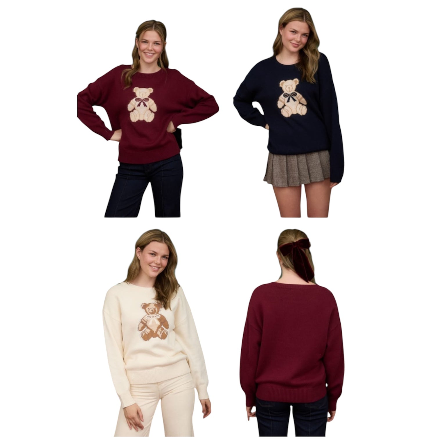 El más dulce y tierno de todos los modelos... un suéter suave y delicado, con estampado de osito al frente a contraste. Un estilo ideal para usarlo con pantalones y faldas de corte a la cintura. Un MUST del otoño!